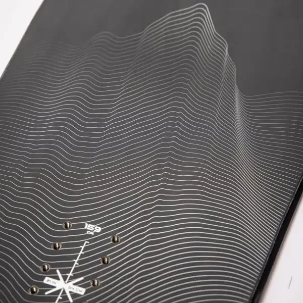 - Radius: Dubbel degressief: een verschillende radius over de lengte van het board, een kleinere radius in het midden en een grotere radius aan de uiteinden waardoor het gemakkelijker wordt om in beide richtingen op dezelfde manier te glijden en te draaien. Dit maakt dit bord zeer vergevingsgezind